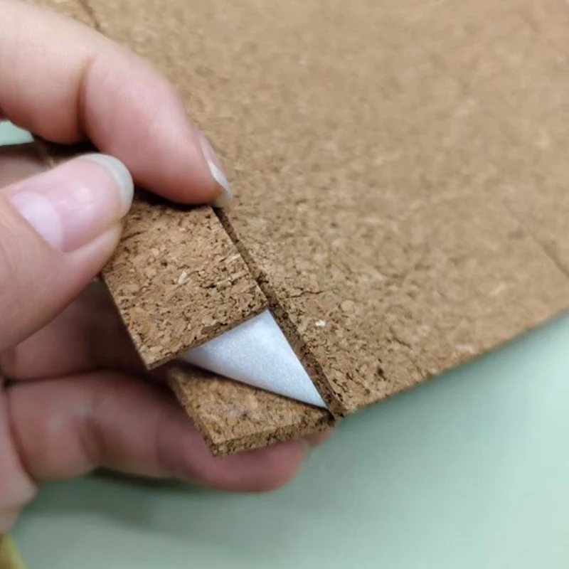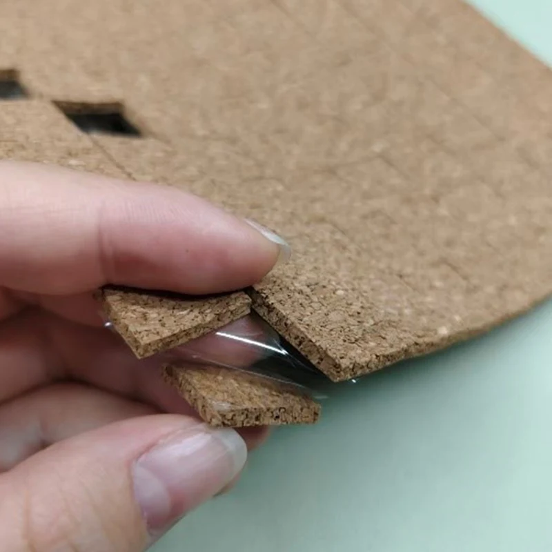 پدهای حمل و نقل چوب پنبه ای 1/8 اینچ 3/4 اینچ x 3/4 اینچ با پشتی چسبیده، که عمدتاً از چوب پنبه و چسب قابل جابجایی تشکیل شده است، و کاغذ یا PET شفاف به عنوان آستر در پشت، بسته بندی شده در جعبه به شکل ورق یا رول، همانطور که در زیر نشان داده شده است: